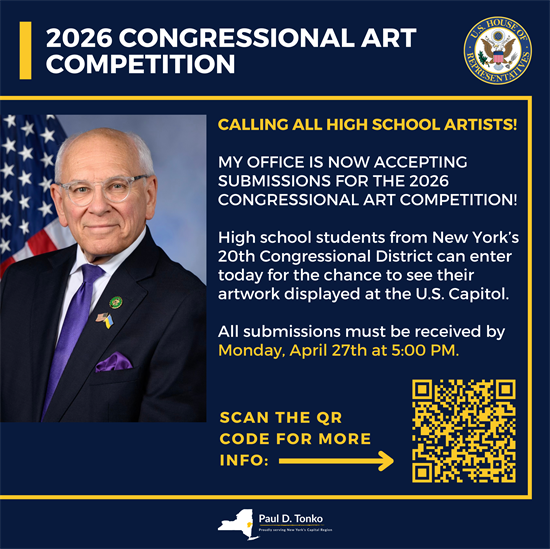 The winning artwork will be displayed in the U.S. Capitol, and the student will be invited to attend a national ceremony in Washington, D.C. on June 25, 2026, with two complimentary round-trip airfare tickets provided by Southwest Airlines. The runner-up’s artwork will be displayed in my District Office. All participants must reside in the 20th Congressional District.