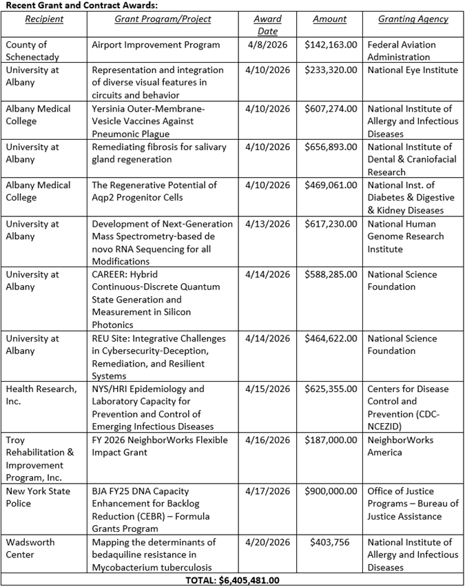 Federal Grant Opportunities: April 21, 2026 My office is sharing the following information on federal grant opportunities available to you. If you are applying for a grant that accepts Congressional letters of support, or if you are seeking additional information or guidance in your application process, please contact our office. We stand ready to assist you. 2025-2026 HEAP Cooling Assistance Benefit Now Open!The 2025-2026 HEAP Cooling Assistance Benefit opened April 15, 2026. Applications will continue to be accepted until funding runs out. Cooling assistance is provided on a first-come, first-served basis.If you are eligible, you may receive one HEAP Cooling Assistance benefit per applicant household for the purchase and installation of an air conditioner or a fan to help your home stay cool. Learn more about eligibility here.You can apply for a HEAP Cooling Assistance Benefit:By Phone: You may call your HEAP Local District Contact. The district will provide more information on eligibility, the application process, and required documentationIn person: You may apply in person at your HEAP Local District Contact Featured Funding OpportunitiesNational Endowment for the Humanities Collections Stewardship ProgramThis program funds projects to preserve and make available physical and digital collections important for research, teaching, and public engagement in the humanities. Awards support the work of libraries, archives, and museums; colleges and universities working on collections access; and organizations that provide preservation services or educate and train students and professionals in collections stewardship.Expected Output: assessments and plans for collections stewardship; conserved or preserved collections; catalog records, finding aids, and metadata; digital surrogates, transcriptions, and indexes; education and training for students and professionals in collections stewardshipThis notice of funding opportunity has two application deadlines: May 11, 2026, and December 15, 2026.Veterans Affairs Adaptive Sports Grant ProgramEarlier this month, the Department of Veterans Affairs today announced the availability of $16 million in grants for national, regional and community-based organizations that provide adaptive sports programs for Veterans and service members with disabilities.Adaptive sports programs offer Veterans supportive and recreational opportunities to improve their independence, well-being and quality of life. These programs include a variety of competitive and leisure activities — such as archery, skiing, cycling, wheelchair softball, hunting, fishing and many others — that enable Veterans to rehabilitate through recreation and encourage an active and healthy lifestyle.The deadline for applications is May 13, 2026.FY26 Safe Streets and Roads for All (SS4A) Grant ProgramThe Infrastructure Investment and Jobs Act (IIJA) established the SS4A competitive grant program with $5 billion in appropriated funds over 5 years, 2022-2026. The SS4A program funds regional, local, and Tribal initiatives through grants to prevent roadway fatalities and serious injuries. Approximately $1 billion is still available for the next funding round. The SS4A program provides funding for two main types of grants: Planning and Demonstration Grants for Action Plans, including supplemental safety planning and/or safety demonstration activities, and Implementation Grants.Learn more about the program by watching one of the recorded informational webinars.The deadline for applications is May 26, 2026, at 5:00 p.m. (EDT).FY24 & FY25 Building Resilient Infrastructure and Communities (BRIC)Last December, New York Attorney General Letitia James won a lawsuit brought with 20 other attorneys general and the governors of Kentucky and Pennsylvania to stop the illegal elimination of the Federal Emergency Management Agency’s Building Resilient Infrastructure and Communities (BRIC) program.BRIC empowers states, local governments, Tribal Nations, and territories to make smart investments in resilient infrastructure. By supporting pre-disaster and hazard mitigation projects — such as school safe rooms, utility hardening, relocating critical facilities out of flood areas, and securing pump stations — BRIC aims to save lives, protect property, and reduce the cost of future disaster response and recovery.Subapplications are due to NYS Division of Homeland Security and Emergency Services (DHSES) through FEMA GO (FEMAGO - Login) no later than May 22nd, 2026. If you intend on applying and would like a Letter of Support, please contact my office! Featured Federal Resources and ProgrammingUPCOMING WEBINAR: How to Apply for COPS Office Notice of Funding Opportunities (NOFO)Applying for funding through the Office of Community Oriented Policing Services requires more than completing an application, it requires strategic alignment with federal priorities and a clear, data-driven approach. This webinar provides a comprehensive walkthrough of how to successfully develop and submit a competitive COPS Office grant application.Thursday, April 23, 2026, 1:00 PM ET. Register Here. Federal Highway Administration (FHWA) 2026 Rural Road Safety Webinar SeriesFHWA’s 2026 Rural Road Safety Webinar Series features presentations on innovative and effective practices that save lives on America’s rural roads. Transportation professionals working in State, regional, local, and Tribal transportation agencies as well as their partners will learn how to implement proven and promising strategies, tools and technologies to advance the Safe System Approach in rural areas.Recording available for Accelerate Delivery of Road Safety Projects in Rural Areas: Successful Implementation of Modular Designs and MaterialsThis webinar featured presentations from Nebraska DOT on installing a modular roundabout on a rural highway; Omaha Department of Public Works on installing modular roundabouts and mid-block crossings on local roads; and Californi
